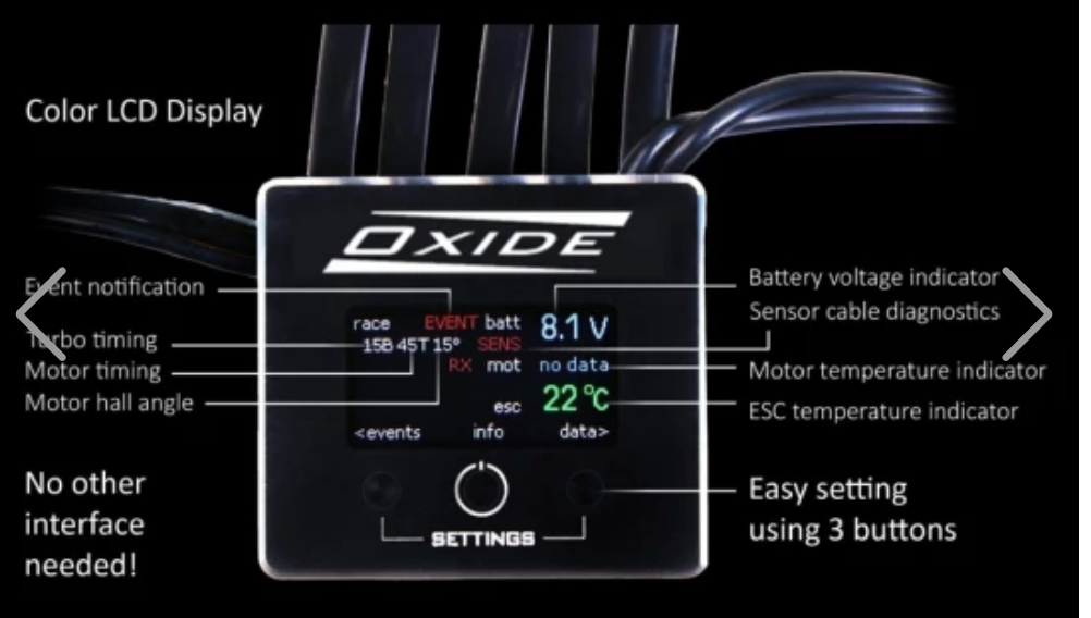 As you got used to by ELCERAM speedos, OXIDE 1/10 is endowed with necessary LCD color display. Thanks to this you can set all the parameters and check all data directly at your ESC, without need of any programming card or a mobile application. All you need is inside your ESC.